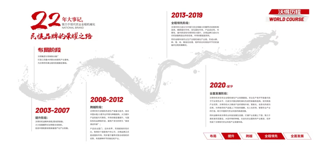沃得農(nóng)機(jī)隸屬于中國(guó)民營(yíng)企業(yè)500強(qiáng)之一的江蘇沃得集團(tuán),占地面積3000余畝,員工8000余人,2016年實(shí)現(xiàn)銷售70億元人民幣,是一家集研發(fā)、生產(chǎn)、銷售、服務(wù)于一體的大型現(xiàn)代化農(nóng)機(jī)裝備制造企業(yè)。沃得農(nóng)機(jī)立足水田,致力于現(xiàn)代農(nóng)業(yè)全程機(jī)械化,歷經(jīng)近30年發(fā)展,產(chǎn)品形成以耕-種-田間管理-收獲-秸稈綜合利用-糧食后處理全系列產(chǎn)品線。依托優(yōu)質(zhì)的產(chǎn)品和誠(chéng)信的服務(wù),公司產(chǎn)品暢銷全國(guó)28個(gè)省市自治區(qū),出口至世界38個(gè)國(guó)家和地區(qū)。